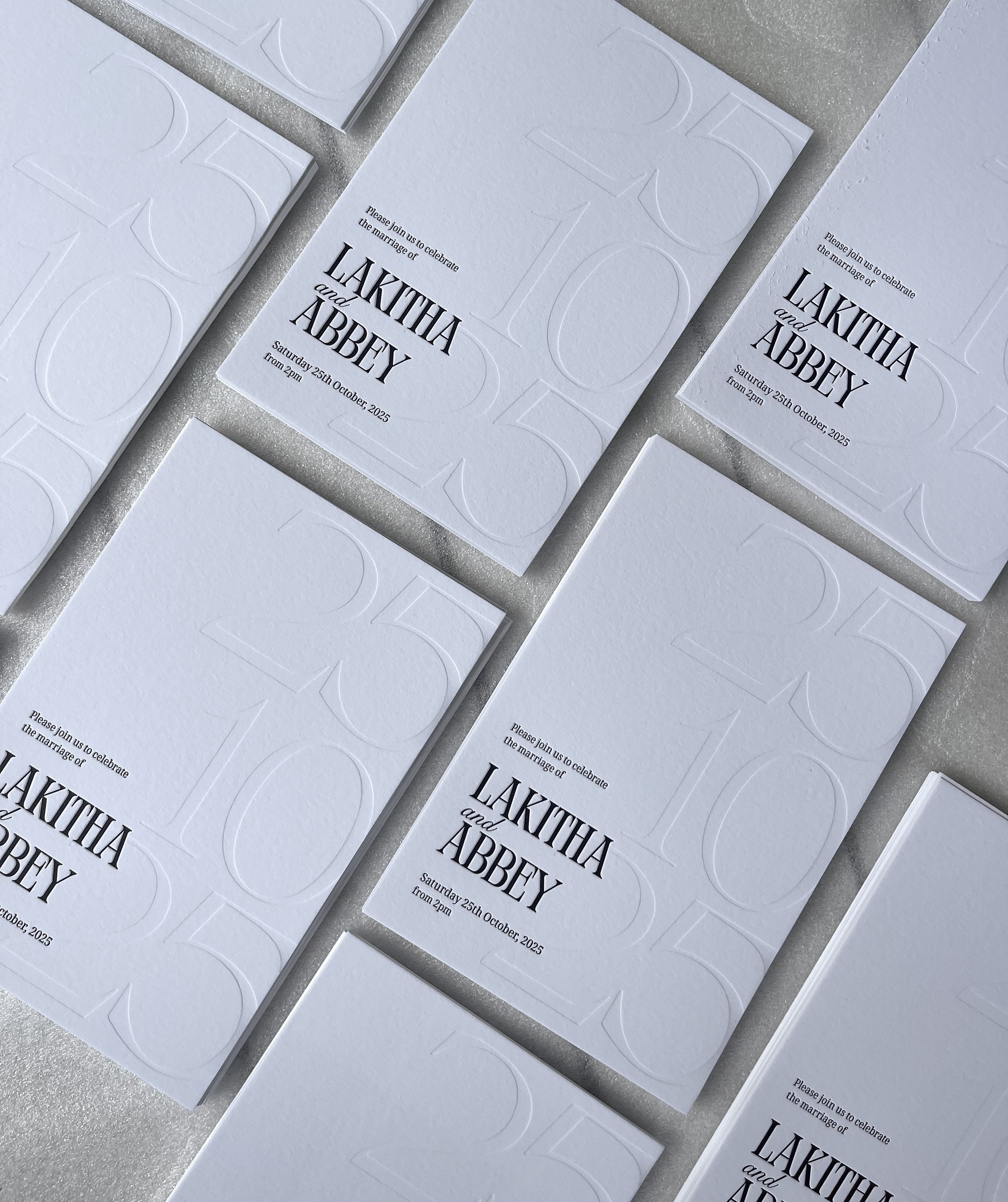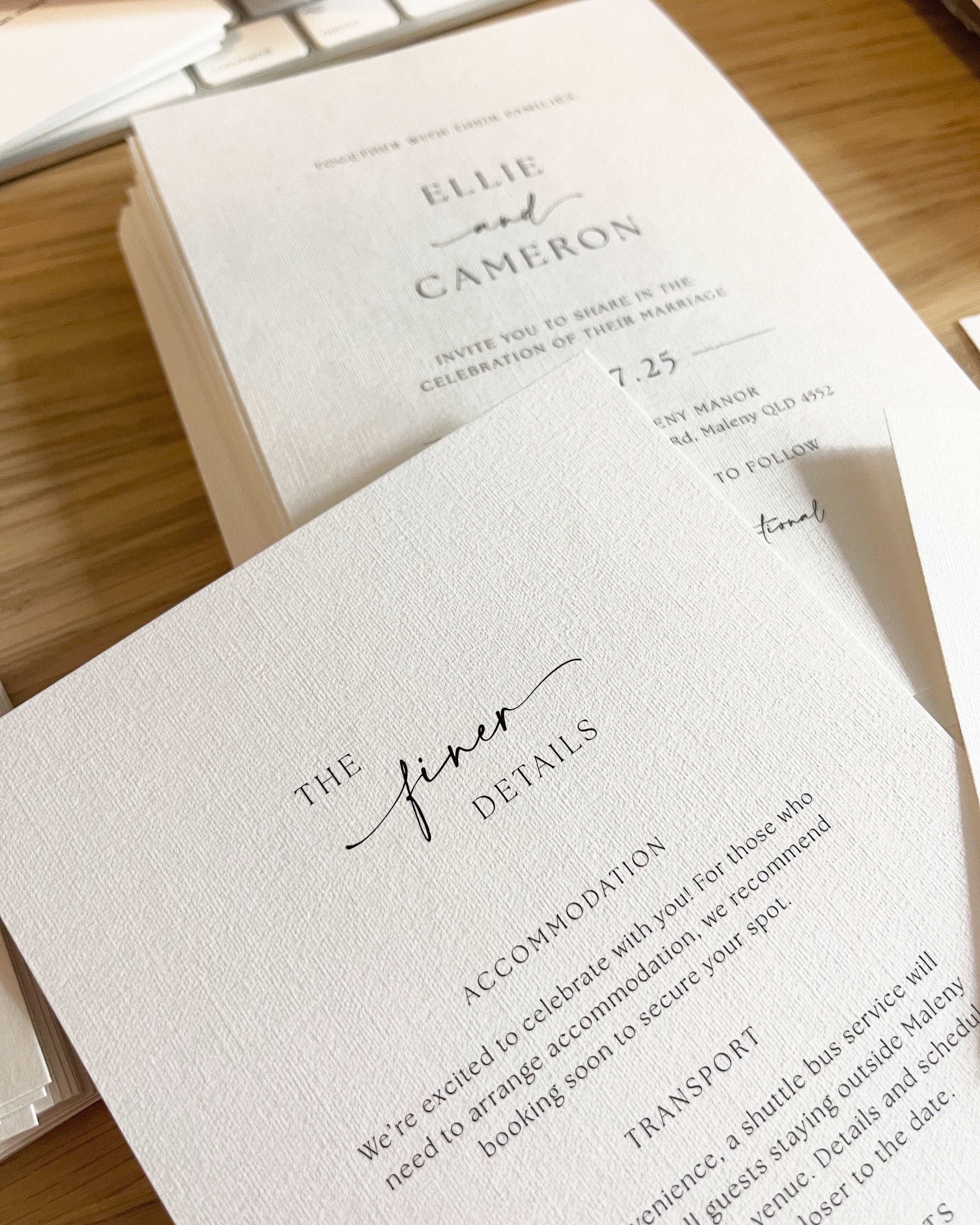 We specialise in custom wedding invitation suites and cohesive on-the-day stationery. Explore our range of premium cardstock colours, die-cut shapes and ordering timelines.